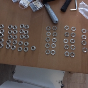 All holes are punched. The tarp is ready for the eyelets now. Notice the four pieces of painting tape, they constantly came in handy with positioning the tarp on the frame.